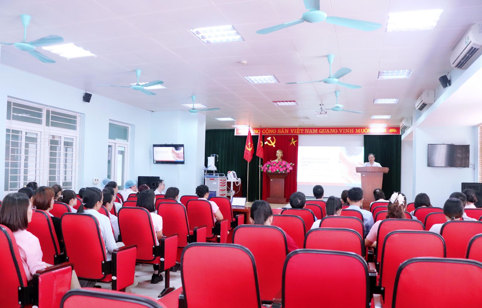 Tại buổi tập huấn, các học viên đã được bác sĩ CKI Nguyễn Văn Nghiệp – Phó Trưởng Khoa Cấp cứu – Hồi sức tích cực và chống độc – Thận nhân tạo truyền đạt những kiến thức về nhận biết sớm dấu hiệu ngừng tuần hoàn, quy trình hồi sinh tim phổi (CPR), kỹ thuật ép tim ngoài lồng ngực, hà hơi thổi ngạt đúng cách; cách xử trí nhanh các trường hợp đuối nước thường gặp trong cộng đồng. Đồng thời, các học viên đã được thực hành trên mô hình, giúp cán bộ y tế tuyến cơ sở nâng cao kỹ năng xử trí tình huống thực tế, đảm bảo phản ứng nhanh, chính xác ngay từ những phút đầu tiên – “thời gian vàng” quyết định sự sống của người bệnh.