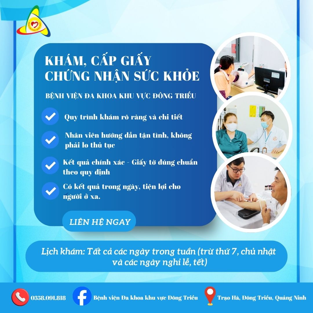 Bệnh viện Đa khoa khu vực Đông Triều luôn nỗ lực mang đến dịch vụ khám sức khỏe uy tín và chi phí hợp lý, góp phần giúp người dân dễ dàng hoàn thiện các thủ tục cần thiết trong học tập và công việc. Nếu có nhu cầu khám sức khỏe thi giấy phép lái xe các hạng, khám sức khỏe xin việc hoặc các mục đích khác, người dân có thể đến trực tiếp bệnh viện để được hỗ trợ nhanh chóng và chu đáo.