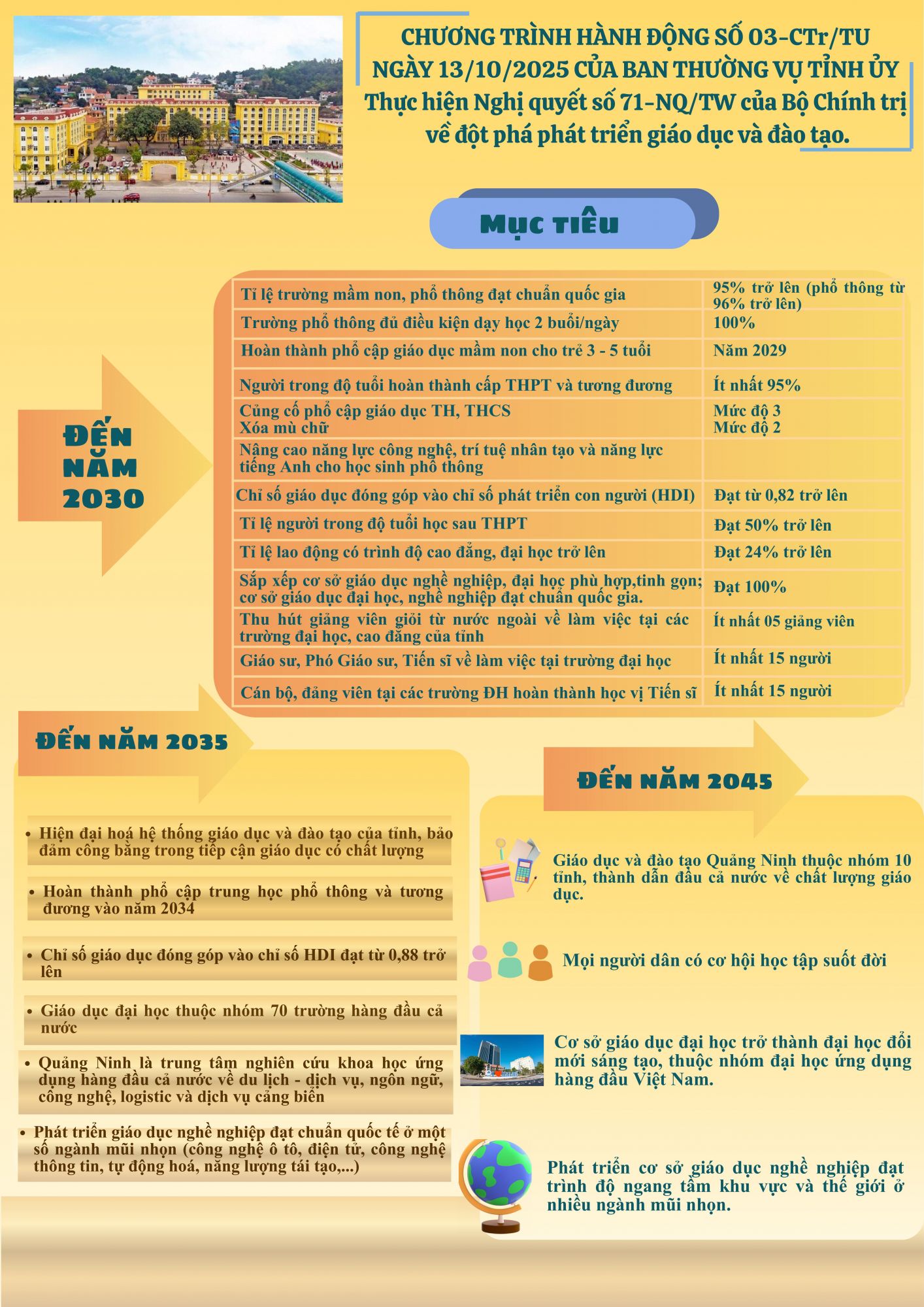 Chương trình hành động số 03-CTr/TU ngày 13/10/2025 của Ban Thường vụ Tỉnh uỷ thực hiện Nghị quyết 71-NQ/TW, ngày 22/8/2025 của Bộ Chính trị về đột phá phát triển giáo dục và đào tạo.