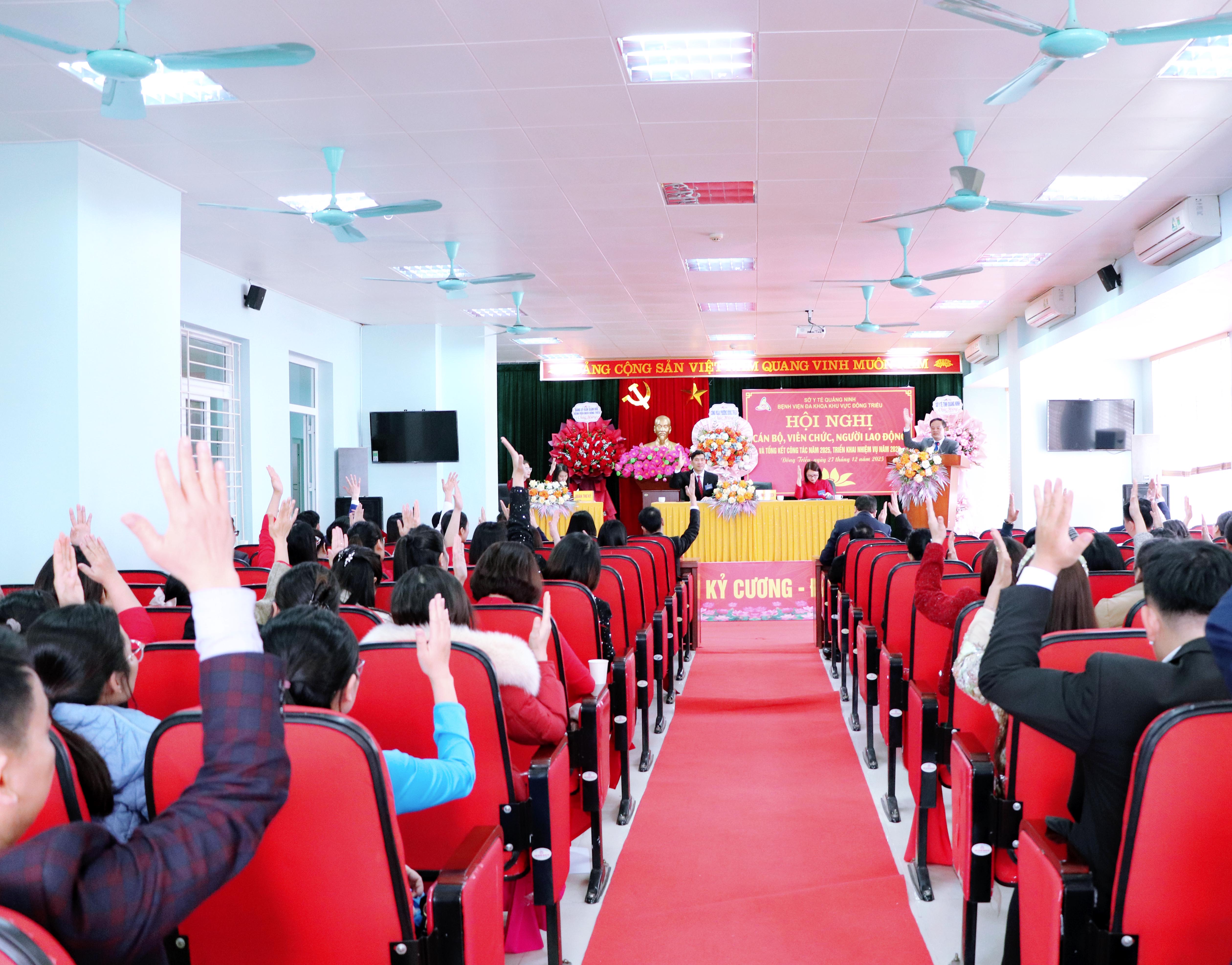 Tại Hội nghị cũng đã tiến hành bầu Ban Thanh tra nhân dân; thông qua báo cáo tài chính năm 2025; báo cáo dự thảo sửa đổi, bổ sung Quy chế chi tiêu nội bộ năm 2026; ký giao ước và phát động thi đua năm 2026; thảo luận, đóng góp nhiều ý kiến thiết thực liên quan đến điều kiện làm việc, chế độ chính sách, công tác chuyên môn, đào tạo nâng cao trình độ và xây dựng môi trường làm việc chuyên nghiệp, đoàn kết, nhân ái. Thống nhất biểu quyết thông qua Nghị quyết Hội nghị cán bộ, viên chức, người đông năm 2026, làm cơ sở để toàn thể cán bộ, viên chức Bệnh viện Đa khoa khu vực Đông Triều quyết tâm thực hiện thắng lợi các mục tiêu, nhiệm vụ gắn nâng cao chất lượng chăm sóc và bảo vệ sức khỏe nhân dân.