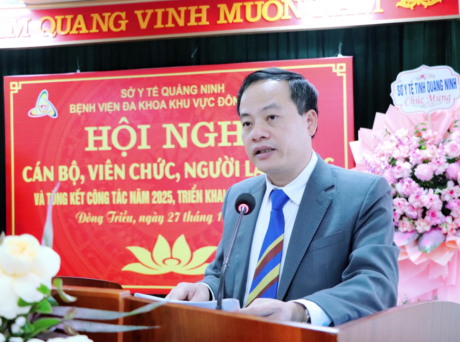 Ngày 27/12, Bệnh viện Đa khoa khu vực Đông Triều đã tổ chức Hội nghị cán bộ, viên chức, người lao động nhằm đánh giá kết quả thực hiện Nghị quyết Hội nghị cán bộ, viên chức, người lao động năm 2025; xây dựng và bàn các giải pháp thực hiện kế hoạch năm 2026, thảo luận quyết định một số nội dung hoạt động cơ quan năm 2026. Dự hội nghị có đồng chí Dương Thị Mỹ Duyên – Đảng ủy viên, Chủ tịch Công đoàn phường Đông Triều; Bác sĩ CKII Lê Kỳ Trường – Bí thư Đảng ủy, Giám đốc Bệnh viện; Bác sĩ CKII Hà Duy Nam – Phó Giám đốc Bệnh viện, Chủ tịch Công đoàn Bệnh viện.